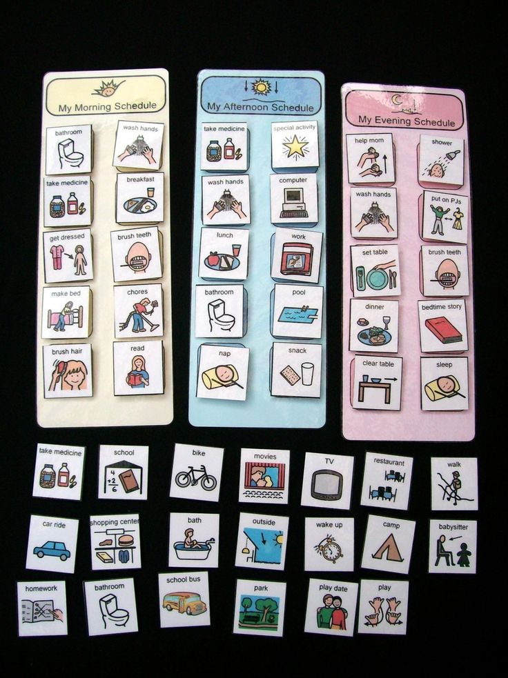 Otra cosa muy útil es tener un programa visual con los planes del día. Haz fotos de los sitios a los que vais , y plastifícalas con velcro por detrás. Modifica cuando sea necesario. Ten otras etiquetas de “hoy, mañana, pasado” . Al principio del día explica con el visual y menciona las actividades por orden, “primero colegio, luego natación y al final cena en casa.” Asegúrate de que señalas la foto correcta y el niño está mirando. También puedes coger su mano y con ella, señalar las actividades.